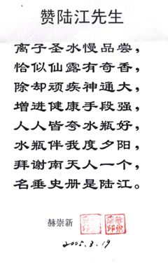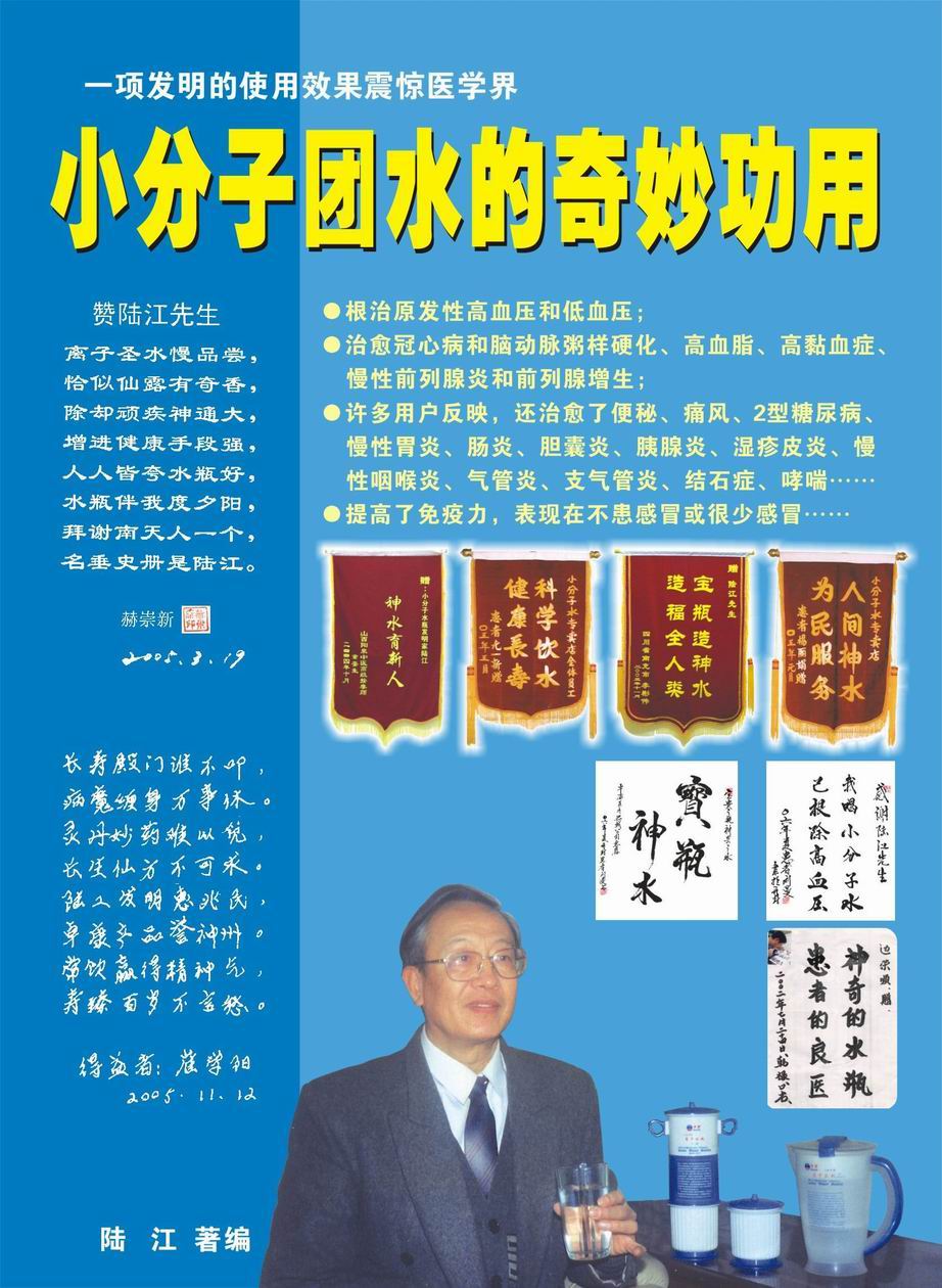 人類幾千年來患以上病癥需終生服藥,幾十年也不能治愈。可是我國南寧的高級工程師陸 江,于1990年想根治高血壓,研究發(fā)明了離子水瓶,處理出微小分子團(tuán)水供飲用,經(jīng)過醫(yī)院臨床試用和專家鑒定,1999年獲中國發(fā)明專利權(quán),產(chǎn)品于2000年投放市場后一直跟蹤調(diào)查,據(jù)全國各地用戶反饋:祛除了高低血壓、糖尿病和冠心病,并使前列腺增生、咽喉炎、鼻竇炎、慢性氣管炎、支氣管炎、矽肺病、哮喘、慢性胃炎、腸炎、慢性膽囊炎、慢性腎炎、腎衰、膀胱炎、便秘、痔瘡、風(fēng)濕性關(guān)節(jié)炎和濕疹皮炎及中風(fēng)后遺癥等病癥不藥而愈。為什么喝微小水能治20多種???陸 江從1991年德國科學(xué)家發(fā)現(xiàn)細(xì)胞膜水通道僅為2納米獲得啟發(fā),認(rèn)為多種器官患病是因細(xì)胞脫水,不能正常代謝和分裂增殖,才使器官細(xì)胞減少致衰弱萎縮而形成細(xì)胞缺水性病癥。22年來的實踐有力地支持了“細(xì)胞脫水致病”這一重要論點,表明喝微小水可滿足細(xì)胞的生理需求,補(bǔ)水就能祛病,是生命科學(xué)新亮點。
