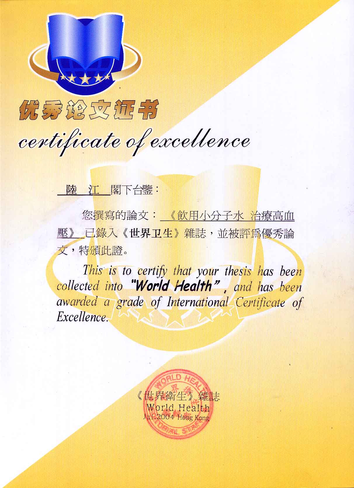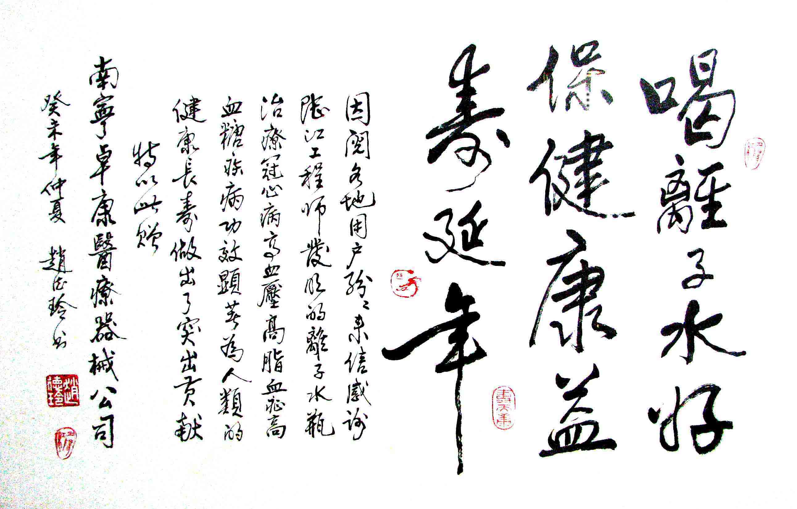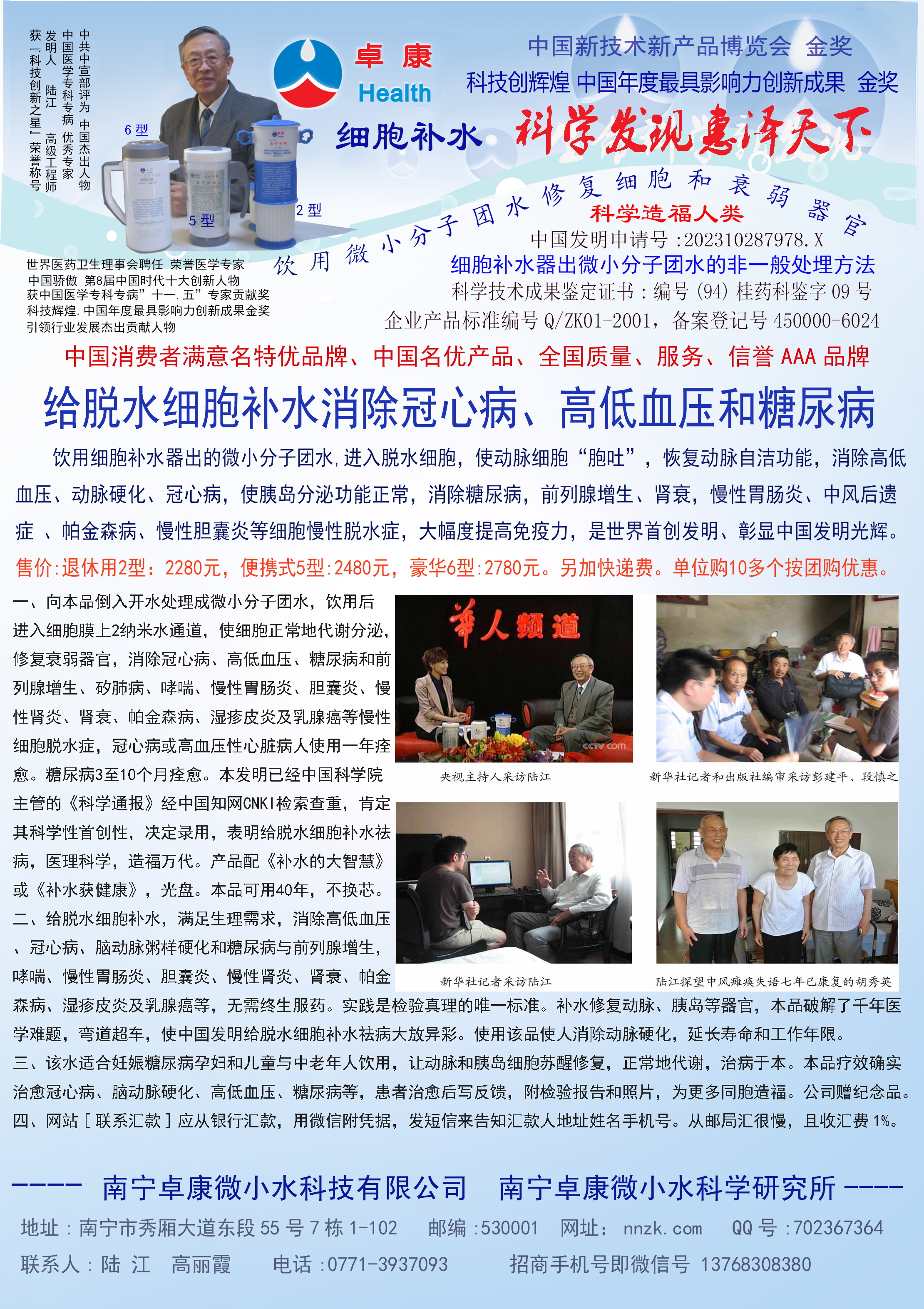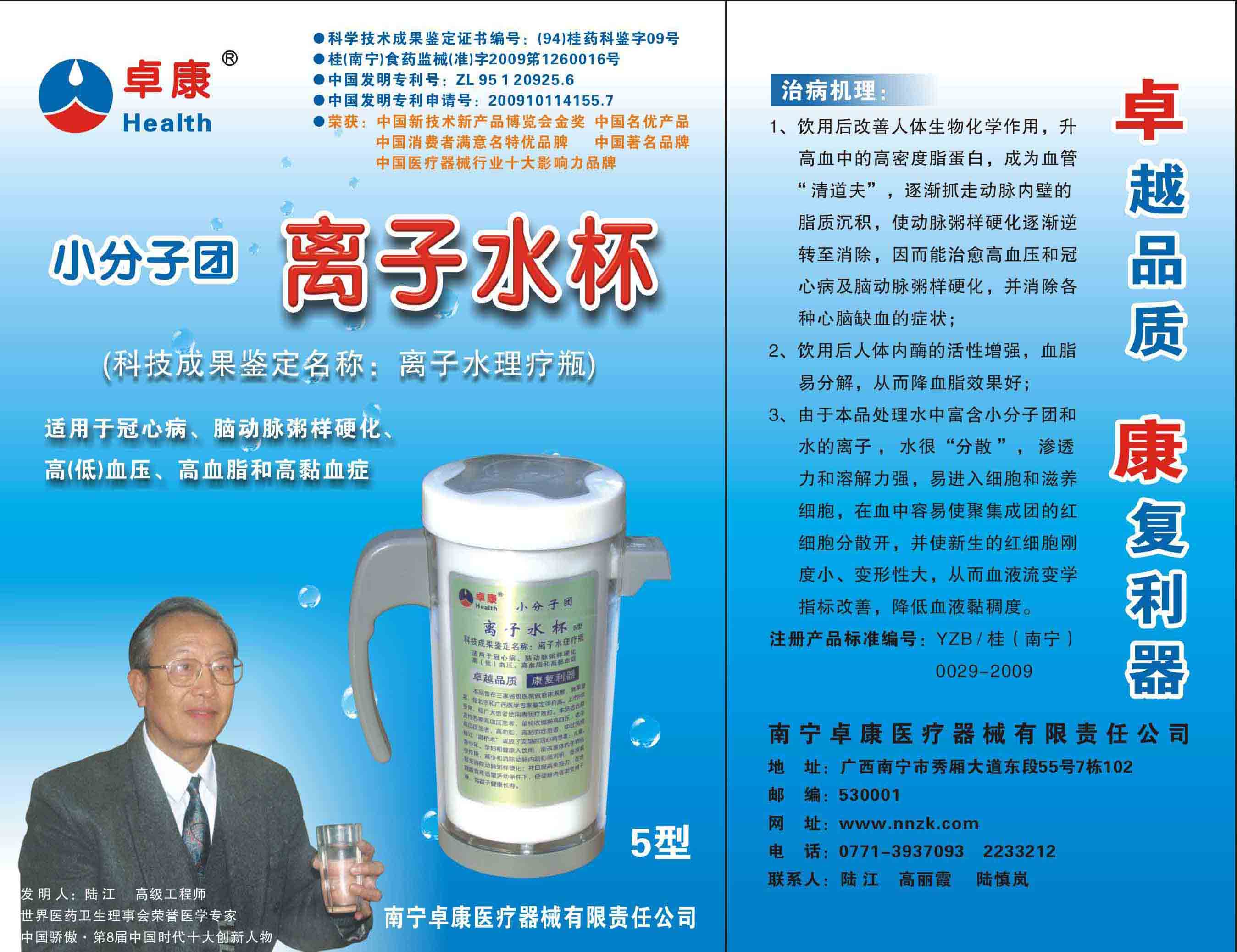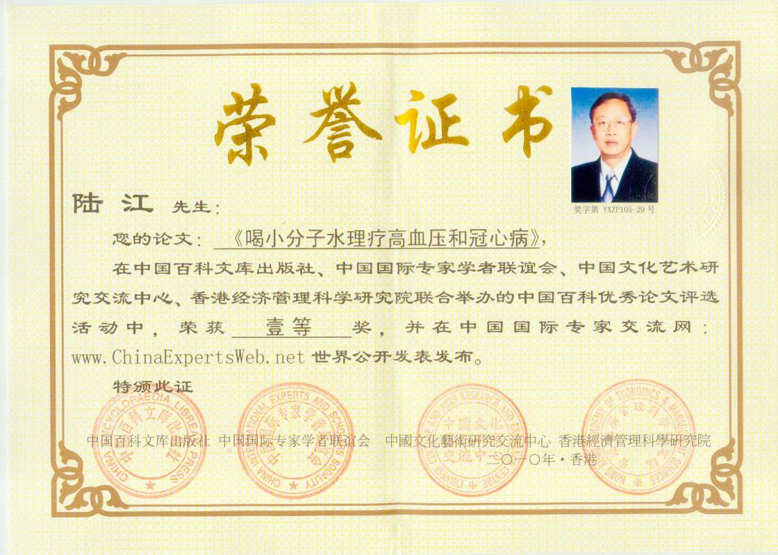 -----我是從事建筑的高工,本來沒有資格去攻克醫(yī)學(xué)難題,卻為了自身健康才扣響醫(yī)學(xué)的大門。由于我1990年患高血壓,因怕中風(fēng)才研究發(fā)明了離子水瓶,我把水處理成微小分子團(tuán)水,飲用后治愈了高血壓。便于1993年底送到三家省級醫(yī)院做臨床試用4個月。經(jīng)北京和廣西醫(yī)學(xué)專家鑒定:"降脂降壓效果好"," 能擴(kuò)大心腦動脈流量,改善心腦電圖以及微循環(huán)","對治療心腦動脈粥樣硬化、高血壓、高血脂有良好的醫(yī)療保健作用。""產(chǎn)品的技術(shù)性能和療效達(dá)到了同類產(chǎn)品的國內(nèi)領(lǐng)先水平,經(jīng)廣西醫(yī)學(xué)科學(xué)情報研究所檢索,未見國外有類似報道。"中國醫(yī)學(xué)科學(xué)院張正國教授從美國國立醫(yī)學(xué)圖書館數(shù)據(jù)庫存Medline檢索英俄文資料,均未見類似報告。2000年上市后,我為了對消費者負(fù)責(zé)而繼續(xù)觀察研究,一直通過《信譽(yù)卡》和《質(zhì)量跟蹤調(diào)查書》向患者承諾療效,請用戶使用6個月后反饋效果。和脂壓患者飲用2至5個月內(nèi),消除癥狀,停服藥物,血壓正常;冠心病患者飲用3~5個月逐漸減輕至消除心絞痛、房顫等癥狀,不再服藥,飲用1年左右心電圖正常,經(jīng)冠脈造影掃描無明顯狹窄,表明冠心病痊愈。大量患者還反映許多衰弱器官被修復(fù),讓前列腺增生、慢性咽喉炎、慢性氣管炎、支氣管炎、慢性胃炎、腸炎和膽囊炎等不藥而愈;2型糖尿病患者是因為胰島衰弱致病,飲用該水半年至一年,逐漸減藥至停藥,血糖尿糖正常,真正治愈2型糖尿病。中風(fēng)后遺癥患者飲用六七個月,可逐漸減輕至消除肢體和語言障礙,表明飲用該水能讓壽命很長的神經(jīng)元細(xì)胞逐漸修復(fù),奇跡般地恢復(fù)肢體和語言功能。飲用后還使胸腺和脾臟兩個重要的免疫器官被修復(fù)和增強(qiáng),產(chǎn)生免疫細(xì)胞多,提高了免疫力,使人不生病或少生病。自此, 飲用微小分子團(tuán)水創(chuàng)造了攻克冠心病、高(低)血壓和糖尿病三大醫(yī)學(xué)難題的奇跡。人們對此感到不可思議,但實踐是檢驗真理的唯一標(biāo)準(zhǔn)。