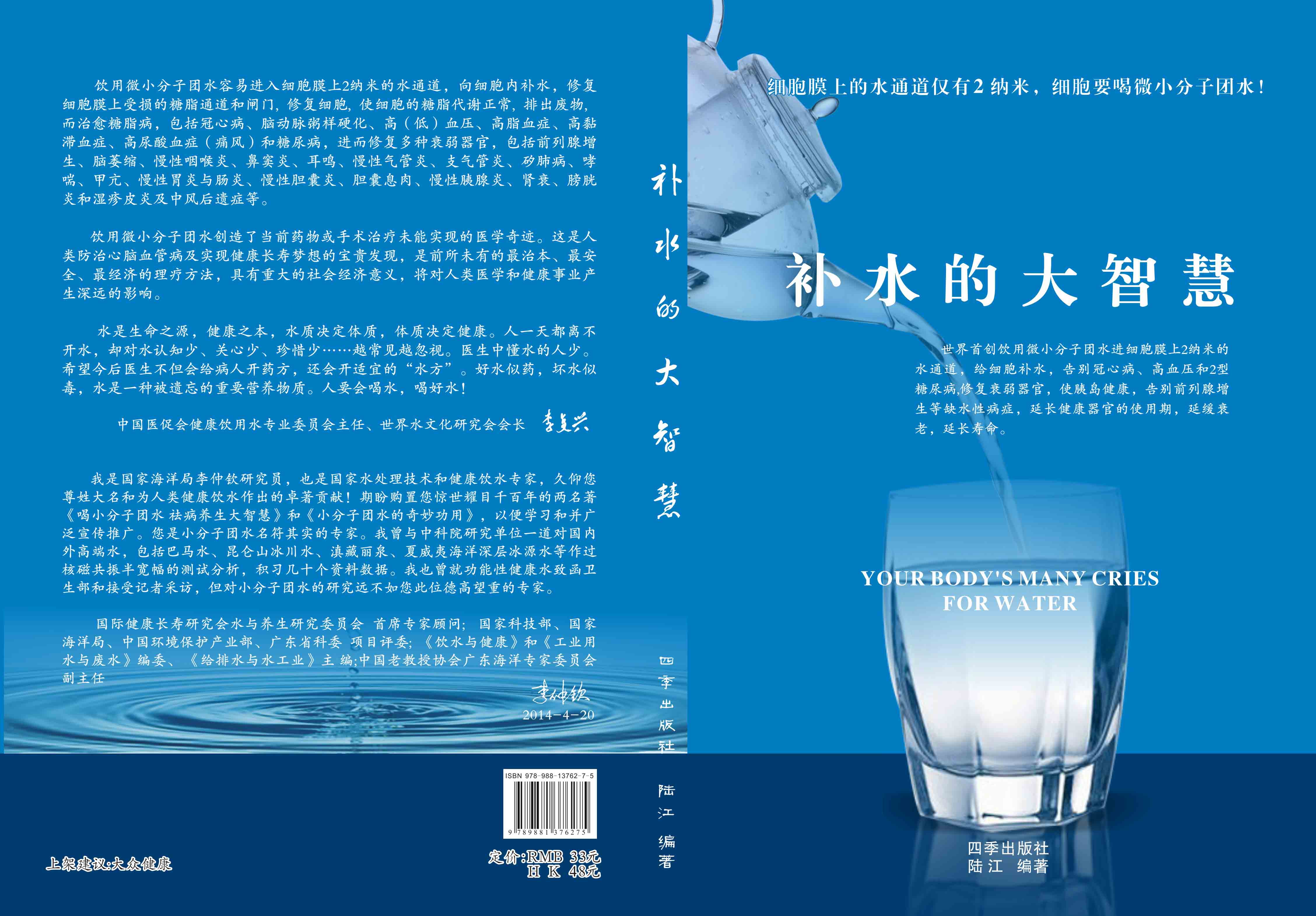 ----幾千年來,人們感到口渴才喝水,誤認(rèn)為口渴是唯一的缺水信號,使喝水量偏少。很多人只知道補(bǔ)血補(bǔ)氣補(bǔ)腎補(bǔ)鈣補(bǔ)硒,而不知補(bǔ)水,逐漸使許多器官缺水,包括皮膚、動脈、氣管、膽囊、腸胃、骨關(guān)節(jié)、腎臟、前列腺和胰島缺水,以致患冠心病、高(低)血壓和糖尿病等缺水性病癥。美國F·巴特曼醫(yī)學(xué)博士寫有《水是最好的藥》一書很受歡迎,我國2007年譯成中文版,論述人體缺水引起許多病癥,他指導(dǎo)3000多患者喝水治愈了哮喘、胃炎和高血壓等病癥。而我是從2000年起,讓患者飲用微小分子團(tuán)水,因為容易進(jìn)細(xì)胞膜上2納米的水通道,治愈了許多缺水性的病。我跟蹤調(diào)查14年,發(fā)現(xiàn)凡是認(rèn)真飲用和合理膳食,可治愈冠心病、高(低)血壓和2型糖尿病與衰弱器官并發(fā)癥及中風(fēng)后遺癥。高血壓患者飲用2~5個月,癥狀消除,不再服藥,逐漸逆轉(zhuǎn)至消除動脈粥樣硬化,血壓正常穩(wěn)定,治愈了高血壓;冠心病人飲用3~5個月,消除心絞痛、房顫等癥狀,不再服藥,一年左右心電圖正常,經(jīng)冠狀動脈造影掃描表明冠脈內(nèi)無粥樣斑塊,真正治愈了冠心病;2型糖尿病人飲用3~10個月停藥,血糖尿糖正常,糖尿病痊愈。并且使前列腺增生、慢性咽喉炎、鼻竇炎、耳鳴、慢性氣管炎、支氣管炎、哮喘、矽肺病、慢性胃腸炎、膽囊炎、胰腺炎、腎衰、膀胱炎、風(fēng)濕性關(guān)節(jié)炎、便秘、痔瘡和濕疹皮炎等不藥而愈,而無需終生服藥。飲用微小分子團(tuán)水治愈的是長期吃藥治不好的病,彌補(bǔ)了幾千年來醫(yī)藥的欠缺,成為人類健康的寶貴資源。