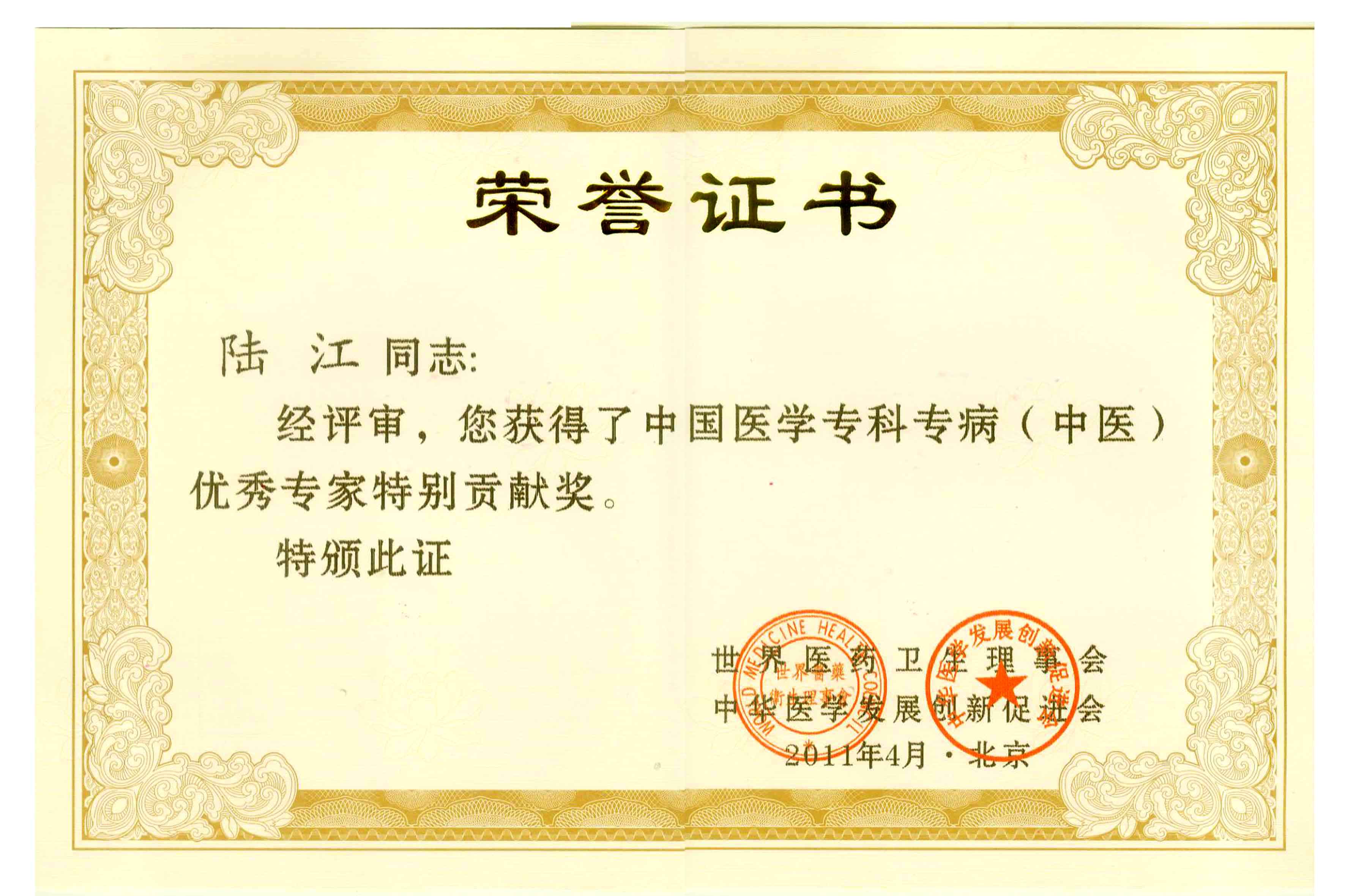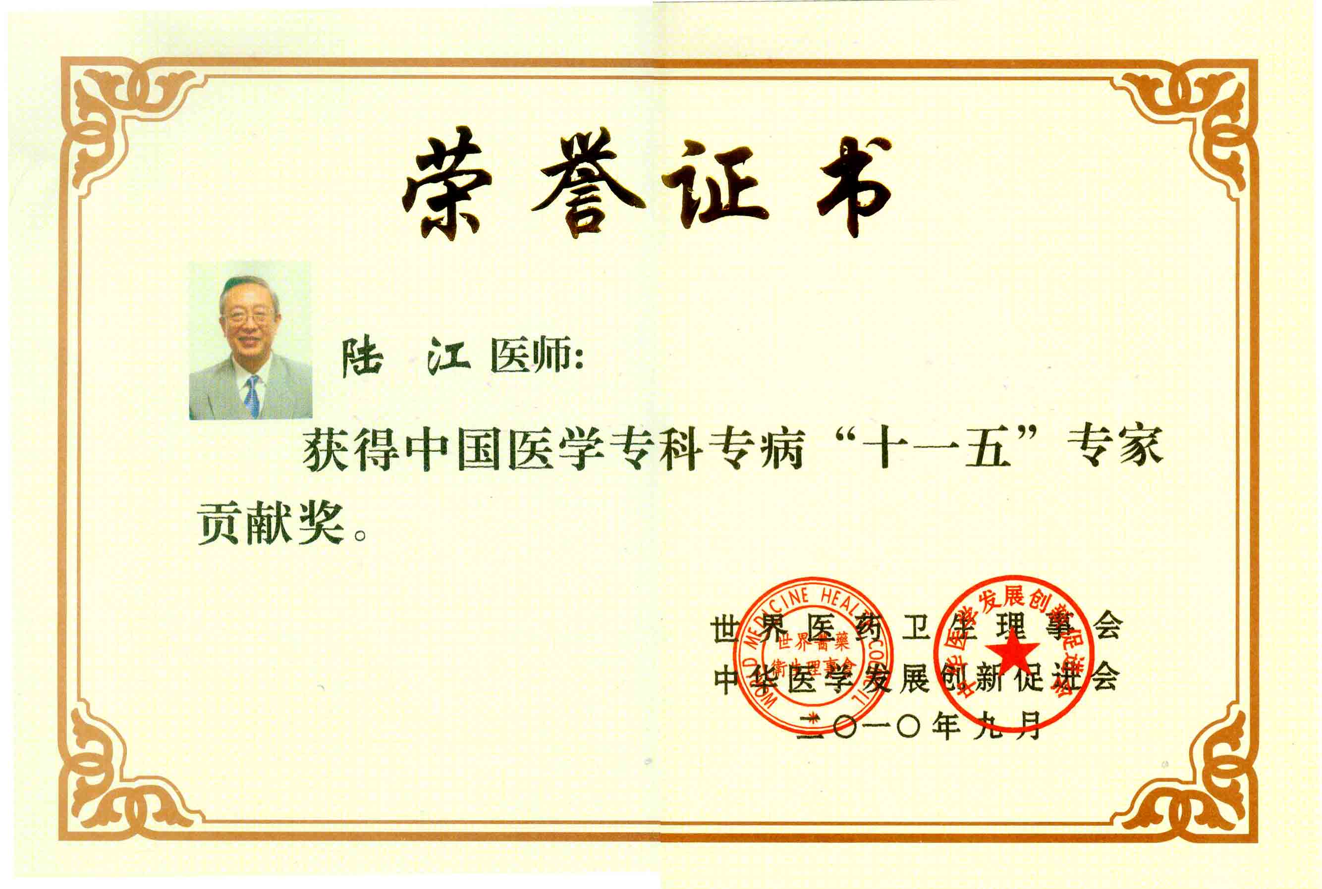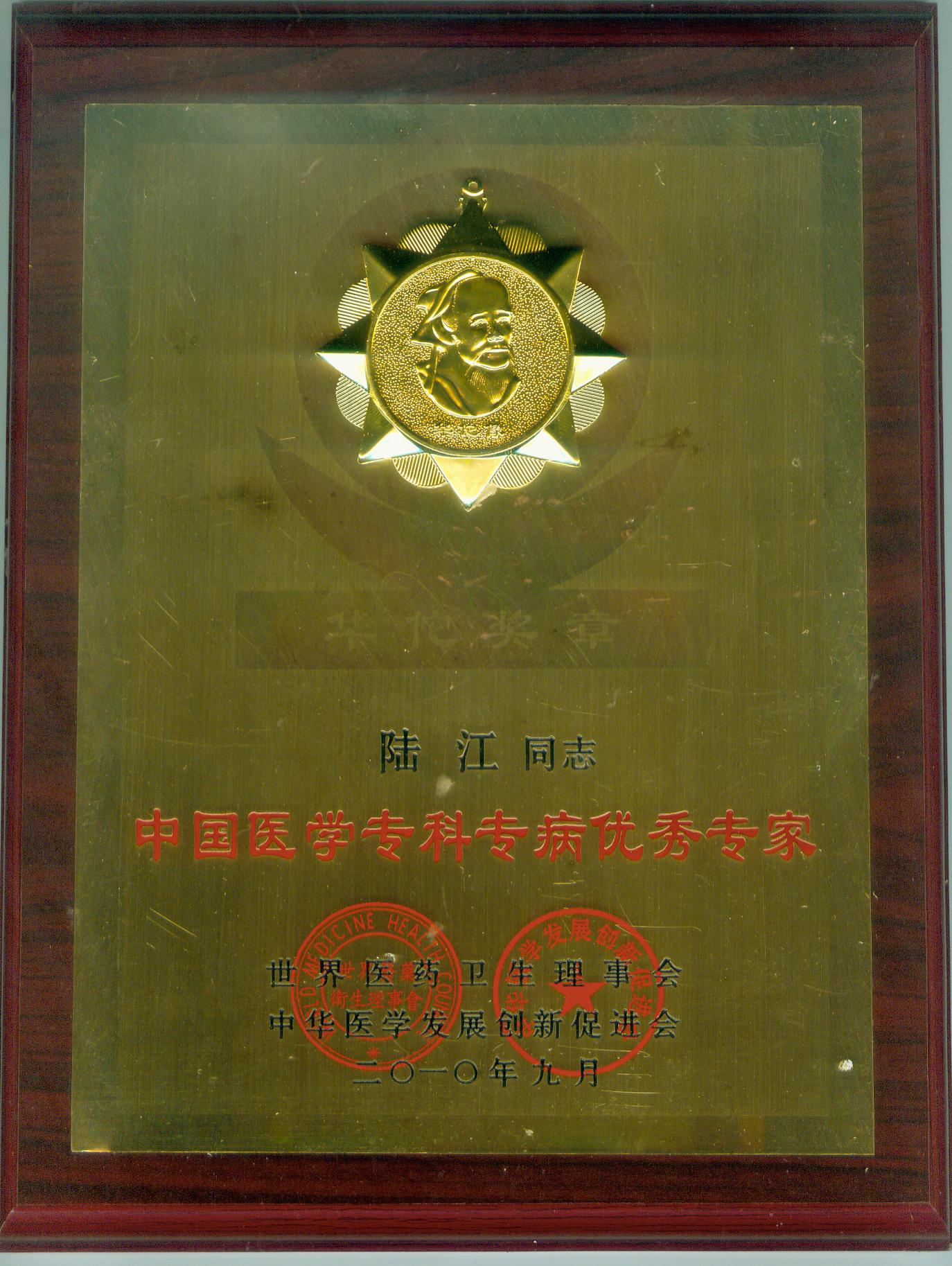 陸江獲得中國醫(yī)學(xué)??茖2?yōu)秀專家恃別貢獻(xiàn)獎