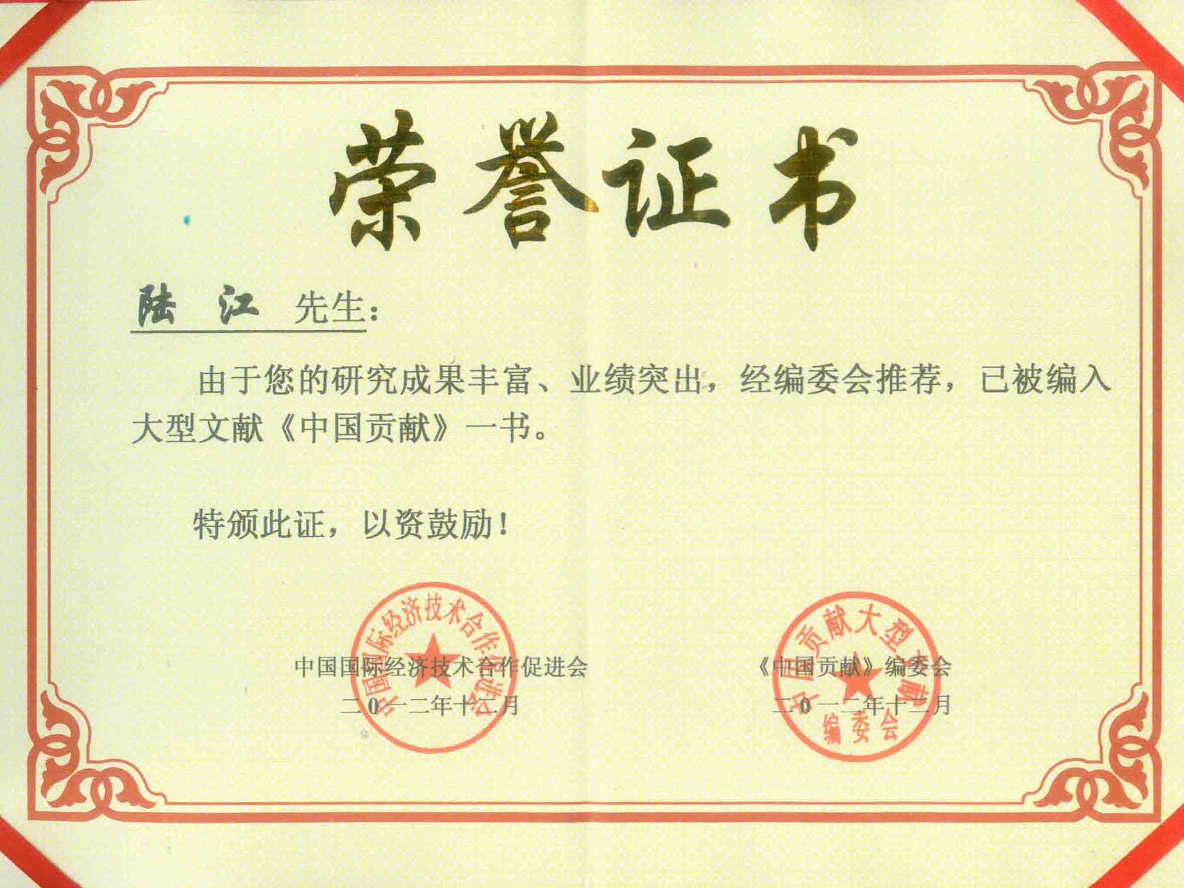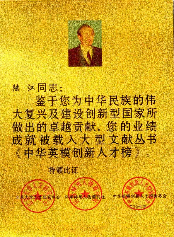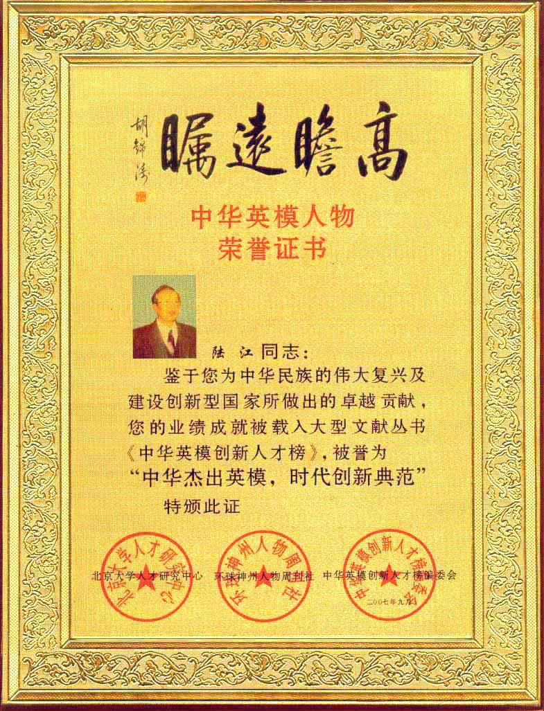 陸江的論文獲一等獎榮譽(yù)證書-- 陸江論文獲創(chuàng)新論文獎牌