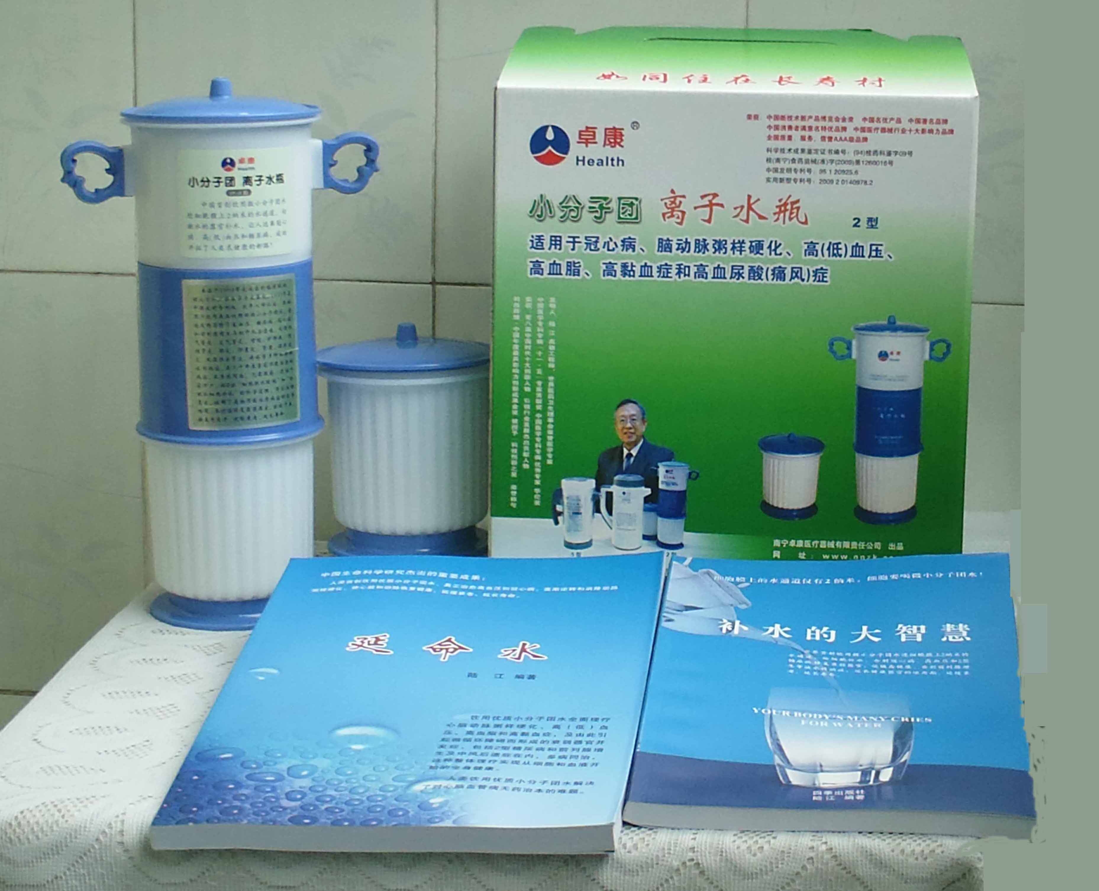 本品大量用戶的使用效果表明,能治愈冠心病、腦動脈硬化、原發(fā)性高(低)血壓、高血脂、高粘血癥、高血尿酸癥(痛風(fēng))和2型糖尿病、衰弱器官并發(fā)癥(前列腺增生、腎衰與尿毒癥)及中風(fēng)后遺癥等療效好。產(chǎn)品配信譽(yù)卡。使用壽命30年,不換芯,易清洗。團(tuán)購優(yōu)惠。從郵局匯款,匯費1%,地址按本頁下方地址、聯(lián)系人寫。從銀行匯款,請點擊[聯(lián)系匯款]欄,從工商銀行匯款,建設(shè)銀行、農(nóng)業(yè)銀行匯款,均免收匯費,匯款后20--30分鐘內(nèi)發(fā)短信,可用微信轉(zhuǎn)帳,均免匯費,微信號即手機(jī)號13768308380。匯款后,告知你的姓名和地址,我公司聯(lián)系人手機(jī)號是:13768308380。卓康牌離子水瓶為我公司獨家生產(chǎn),郵購產(chǎn)品配《補(bǔ)水的大智慧》彩印書一本,另配四季出版社出版的新書《補(bǔ)水的大智慧》一本,并配光盤一張(含央視主持人釆訪陸江的對話視頻)。目前市場和"淘寶網(wǎng)"上有人兜售假冒的偽品,望讀者審察辯別真?zhèn)?,造假者剽竊假冒本公司的各種認(rèn)證、獲獎獎項、專利號和外包裝盒上的中英文字,包括科技成果的鑒定意見等,請讀者注意防偽。如何識別假貨?已經(jīng)買了假貨怎么辦?(請點擊[打假掠影][打假掠影])。